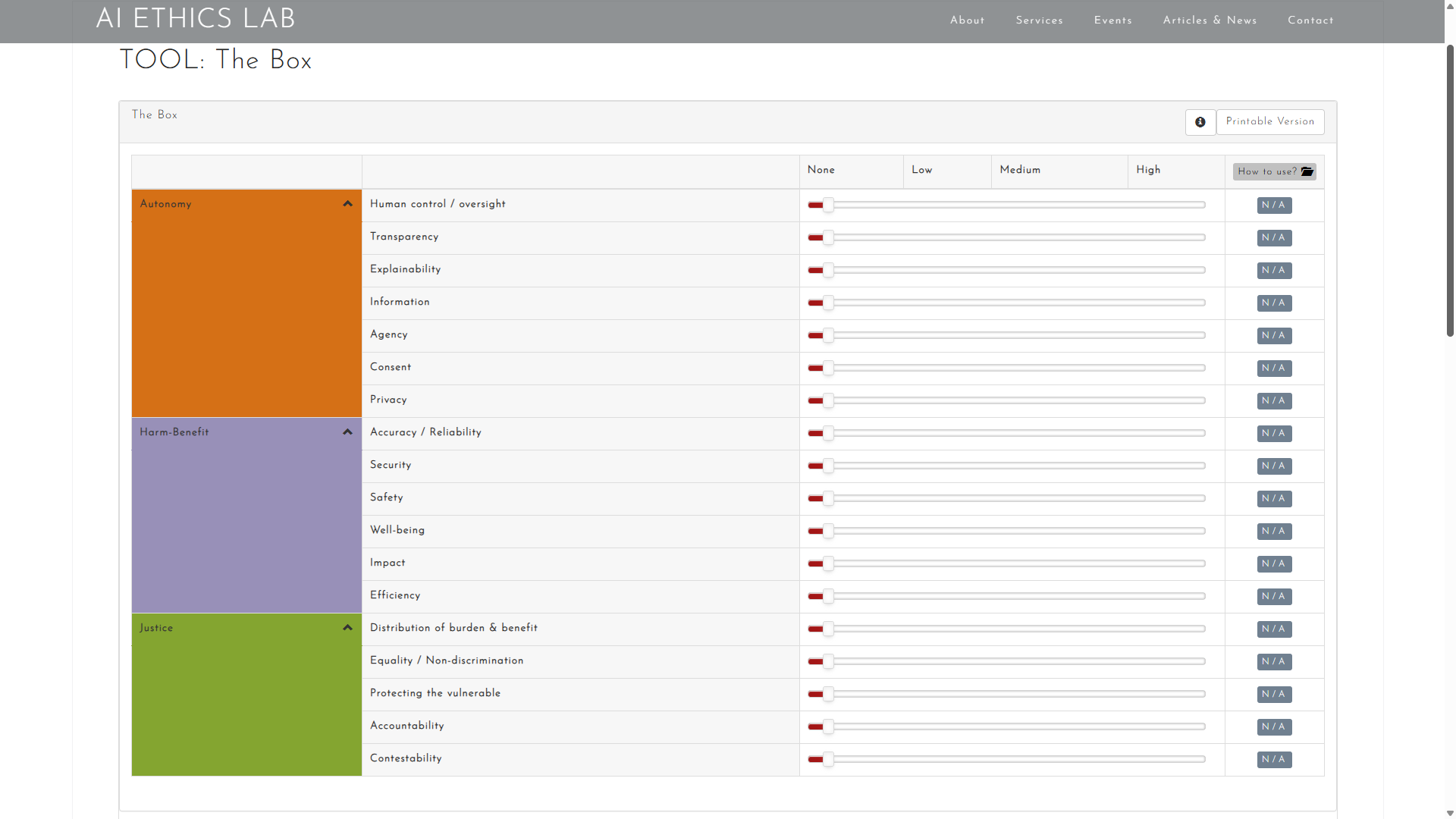 D’un point de vue technique, l’élaboration d’algorithmes de débiaisage qui peuvent compenser en corrigeant, du moins partiellement, ces biais. Un outil comme The Box, une checklist interactive créée par l’AI Ethics Lab (2020), a été conçu comme un élément de réflexion sur la dimension éthique des produits. The Box propose les catégories d’autonomie, de bienfait et de justice comme critères d’évaluation éthiques.